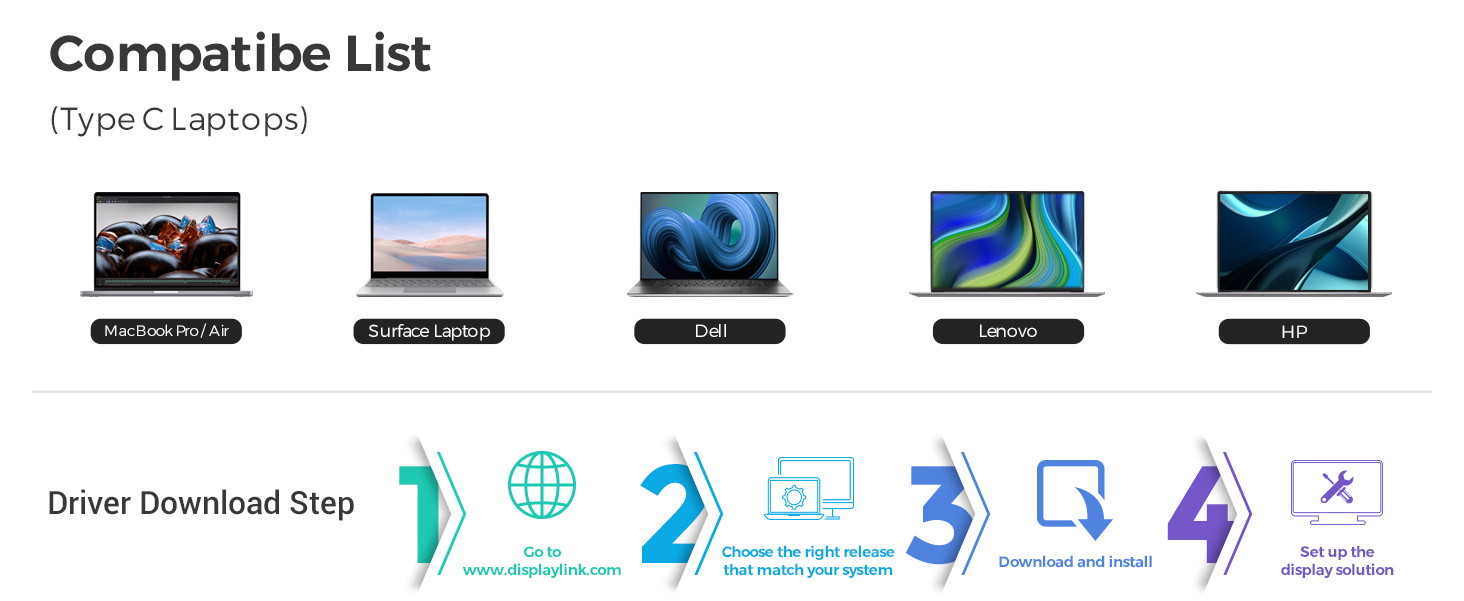UtechSmart D6919 works with any laptop that has a Thunderbolt 4/3, usb4 port or power transfer port (USB 3.1 Type-C (Gen2) DP Alt mode output/HDMI capability.